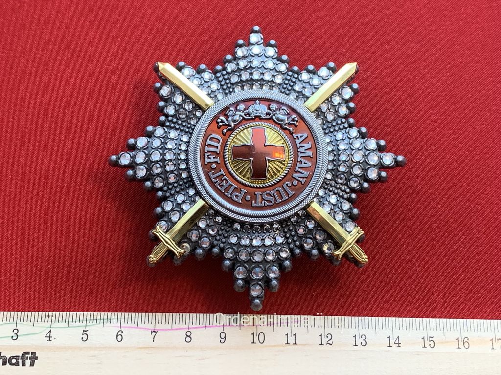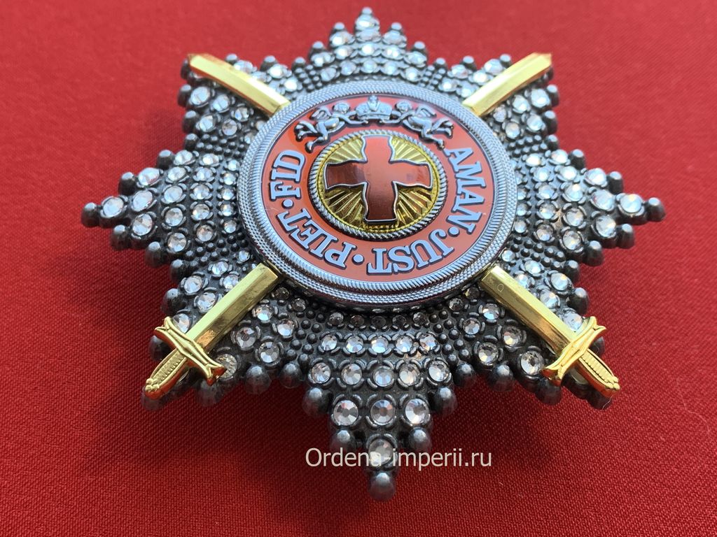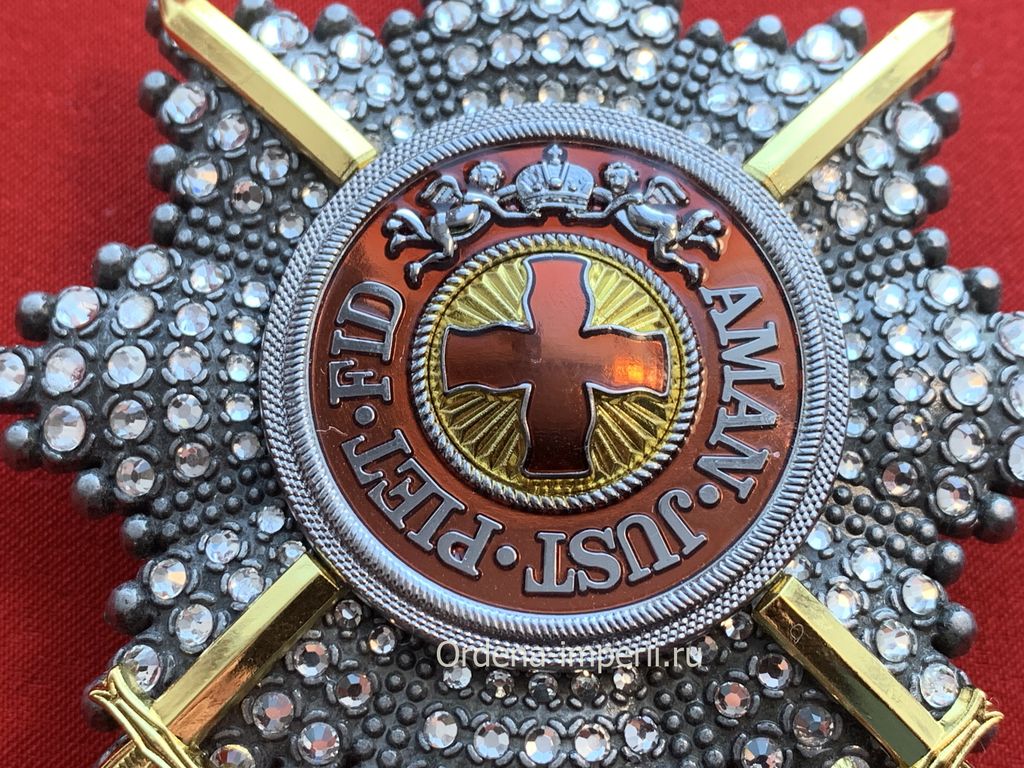 Уникальный лот! Полноразмерная звезда ордена Святой Анны со стразами и мечами, копия LUX! 1797 год. C элементами ручной работы! Выполнена из сплава цветных металлов, с использованием горячих эмалей! Размер 88х88 мм. Вес 115 гр.